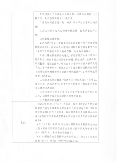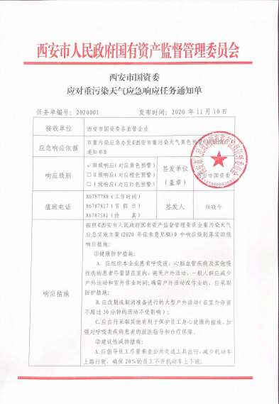 關(guān)于西安市國資委應(yīng)對重污染天氣應(yīng)急響應(yīng)任務(wù)通知(編號:2020001)的要求,請公司各部門及子公司員工明確響應(yīng)級別,做好個人健康及節(jié)能減排相應(yīng)措施。